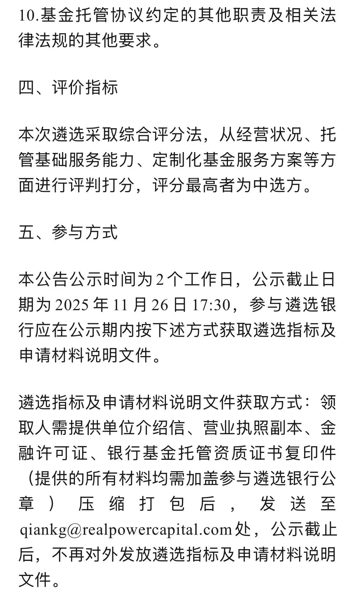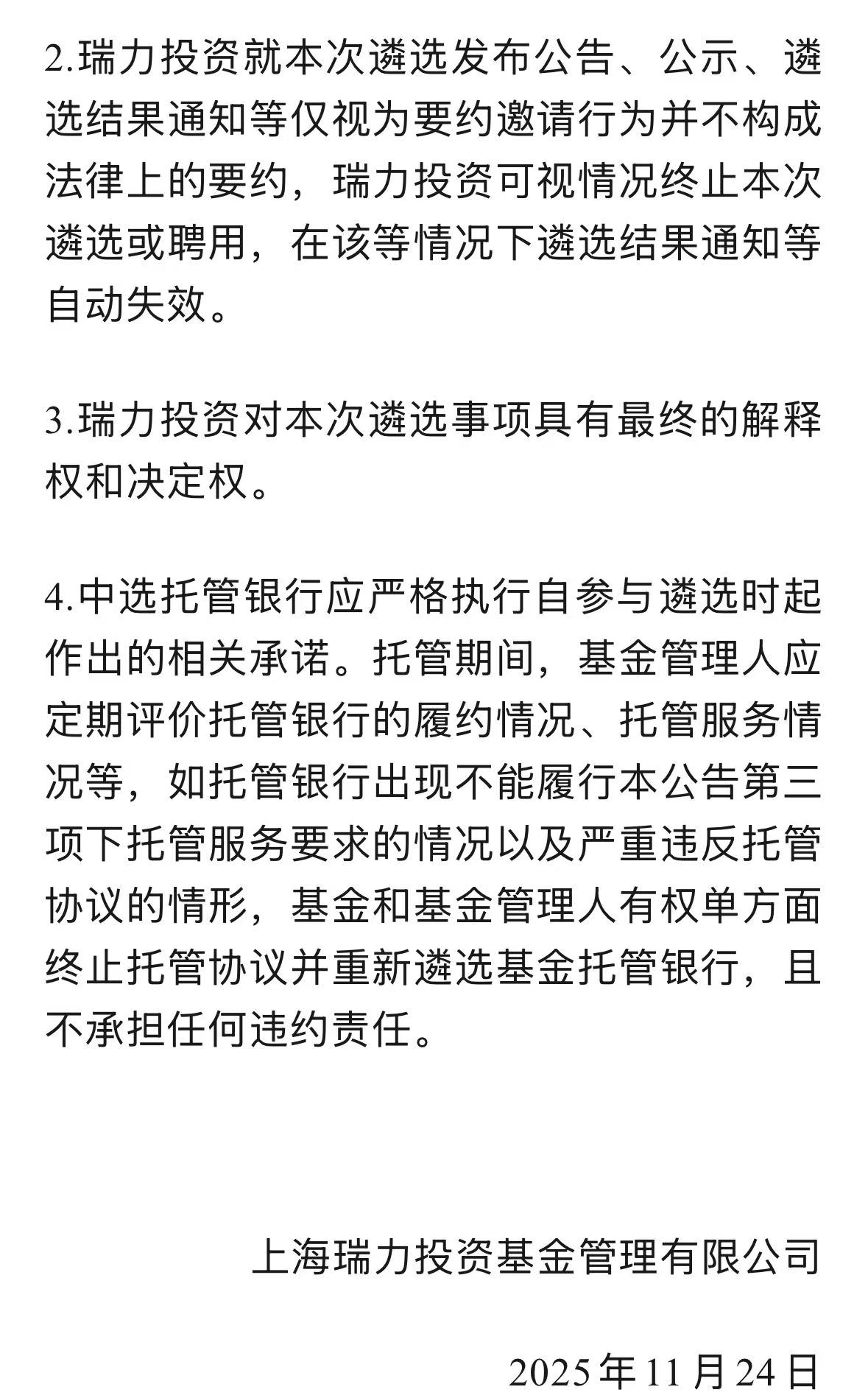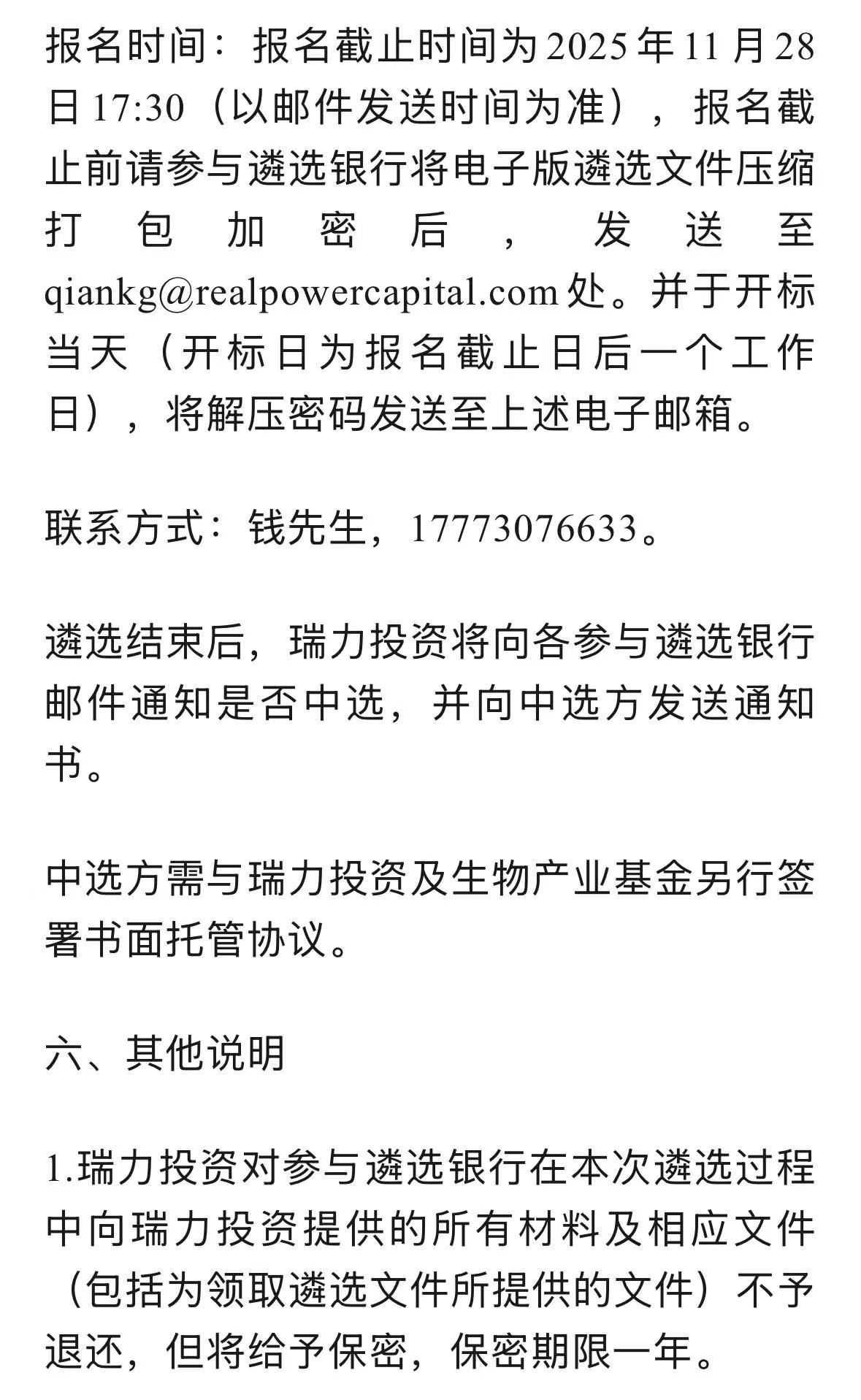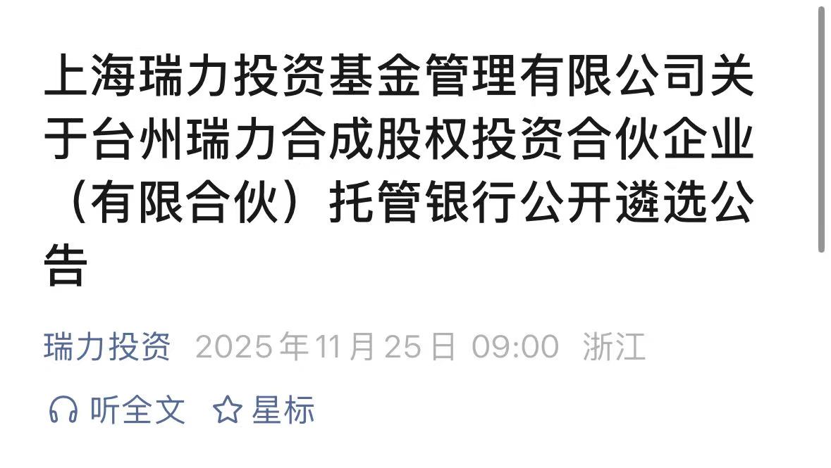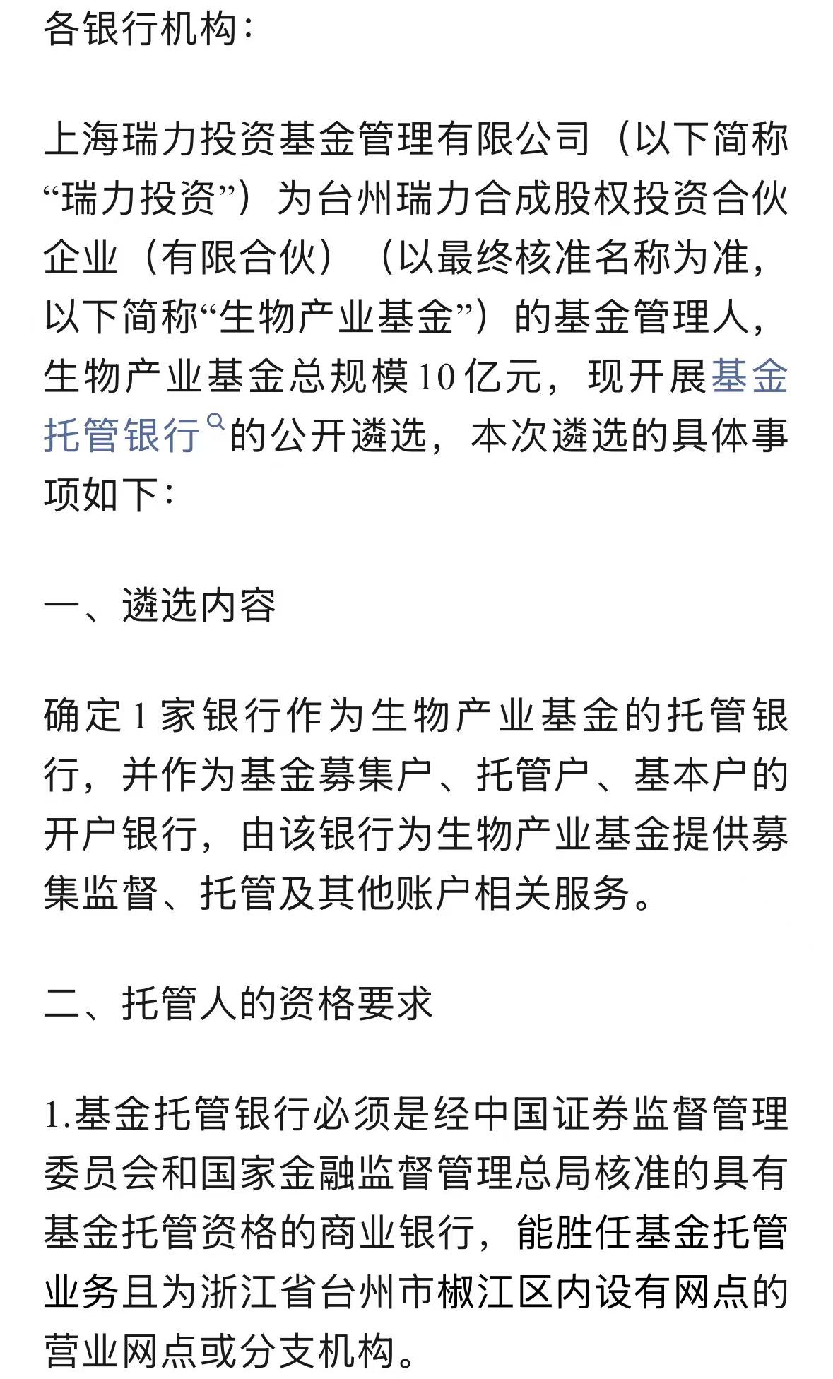 上海瑞力投资基金管理有限公司关于台州瑞力合成股权投资合伙企业(有限合伙)托管银行公开遴选公告